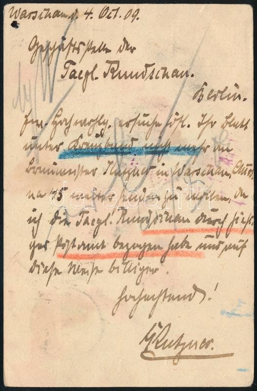 1909 Varsóból Németországba, berlini újságnak orosz levelezőlapon küld...
