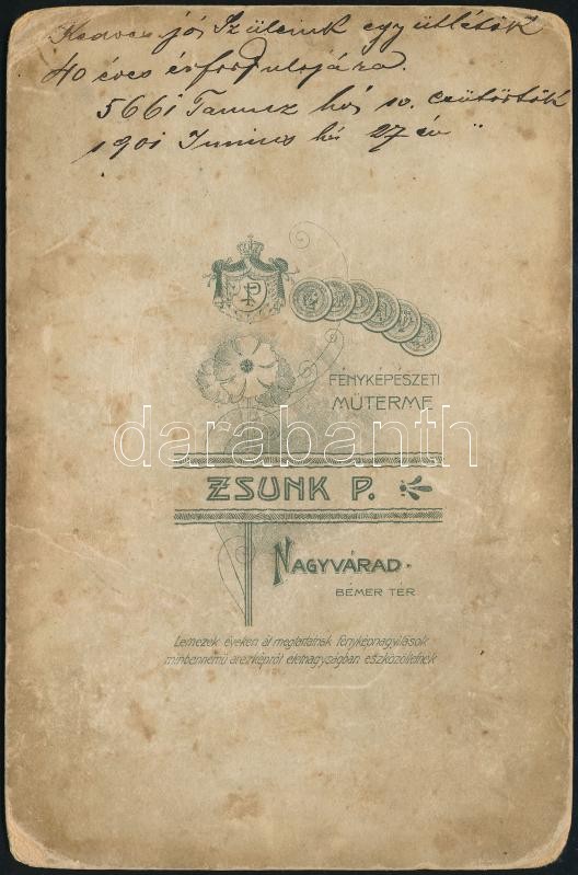 1901 Zsidó házaspár 40. házassági évfordulójukon, keményhátú fotó Zsunk Pál nagyváradi műterméből, kopott, 16,5×10,5 cm