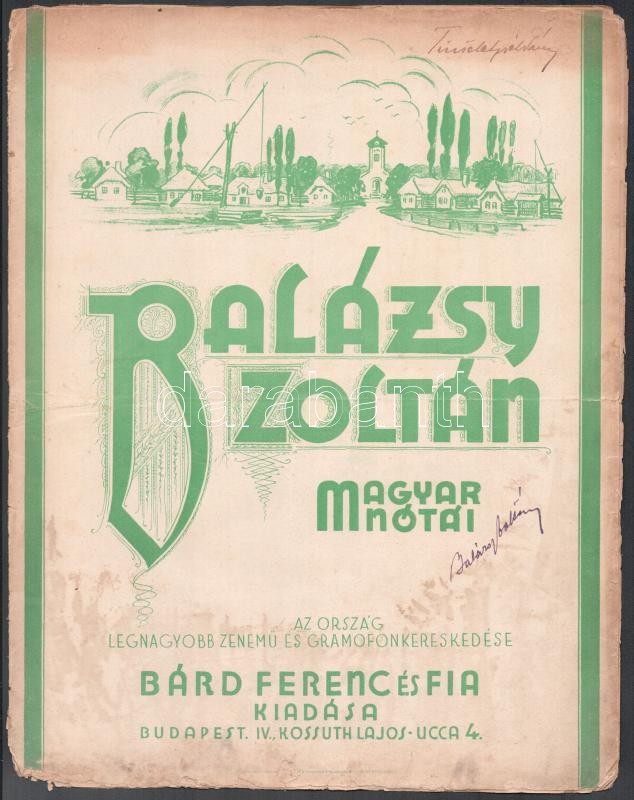 Description: 1929 Balázsy Zoltán magyar nótái. Bp., 1929, Bárd Ferenc és Fia, 6 sztl. lev. Illusztrált borítóval, szakadt, foltos, az elülső borítón kis lyukkal. A szerző által aláírt. "Tiszteletpéldány" bejegyzéssel. + Balázsy Zoltán egy töredékes kottája, 2 sztl. lev.