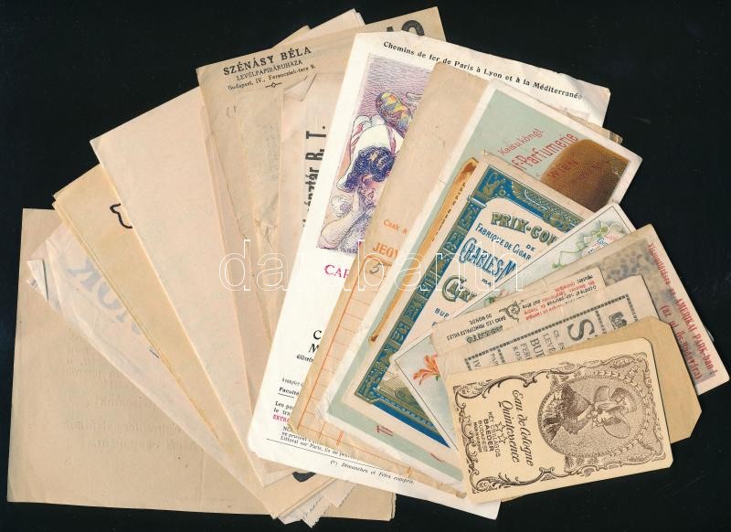 Vegyes papírrégiség tétel, közte: Treu, Nuglisch & C. Nachfolger Carl Thies Glycerin-Eierdotter-Seife, szappan lito reklám kártya, szakadt, Dimitrino & C. egyiptomi cigarettás lito reklám kártya (rajta osztrák és magyar címerrel, Charles M. Rabinovsky egyiptomi cigarettás reklámkártya, Liebig Társaság Húskivonata, lito reklámkártya, 1912-es Nizzai karnevál prospektus, 2 kicsi tasak, Furulyás Jancsi 1912-es operett előadásának grafikus prospektusa (litográfia), ..stb. Összesen 18 db. Változó állapotban. Különféle méretben.