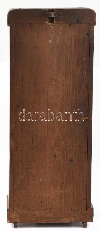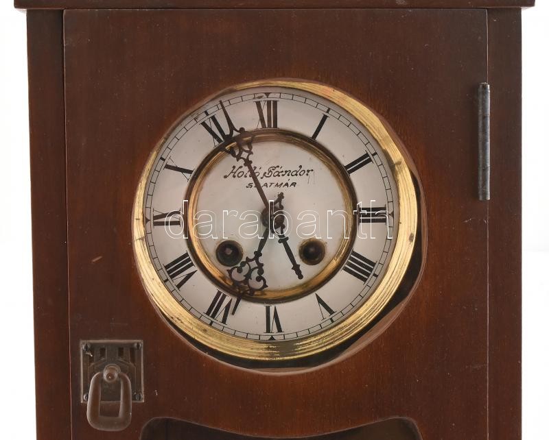 Description: Holló Sándor Szatmár nagyméretű, antik ingás falióra, felesütős, üvegezett fa tokkal, zománcozott számlappal, működik. Kisebb kopásnyomokkal, 62x25x13 cm