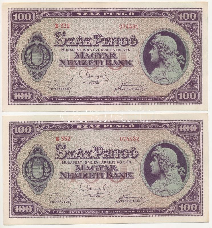 https://www.darabanth.com/en/397-Online-auction/397.0/Numismatics/Hungarian-Banknotes~1500007/1945-100P-2x-sorszamkovetok-E-332-074431-E-332-074432-TII-III-szep-papir-Adamo-P18~II2414666