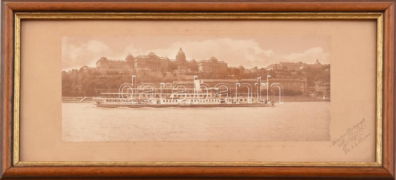 Description: cca 1905-10 A Wilhelm II. gőzhajó Budapesten a Dunán, háttérben a Fiume Szálló és a Budavári Palota, fotó kartonra ragasztva, M. Strobl bécsi fényképész felvétele, jelzett a paszpartun, üvegezett fa keretben, 11,5x29 cm