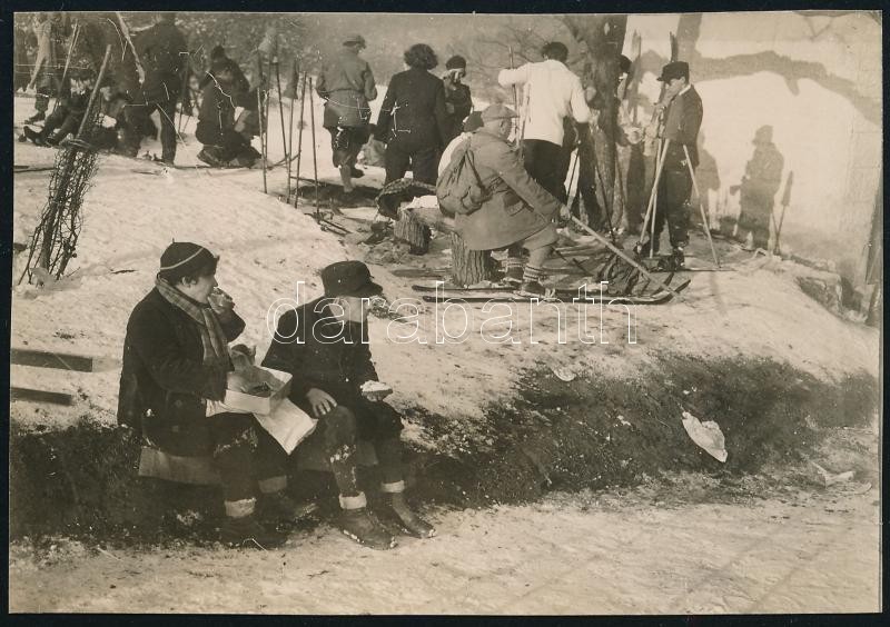 cca 1933 Kinszki Imre (1901-1945) budapesti fotóművész hagyatékából jelzés nélküli vintage fotó (síelők pihenője), 6x8,6 cm