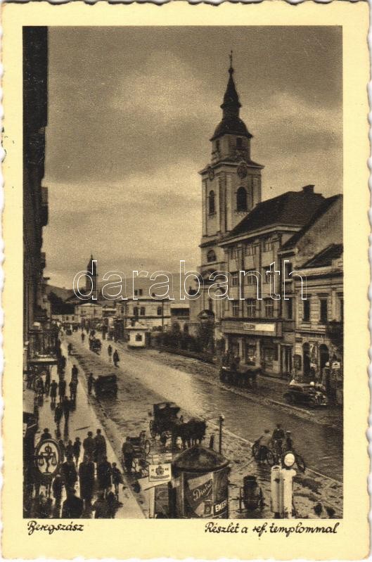 1940 Beregszász, Beregovo, Berehove; utca, református templom / street, Calvinist church