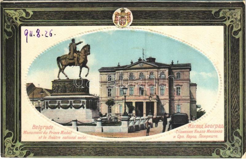1911 Beograd, Belgrade; Monument du Prince Michel et le theatre national serbe / monument, theater. Art Nouveau frame with coat of arms