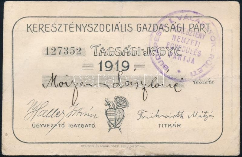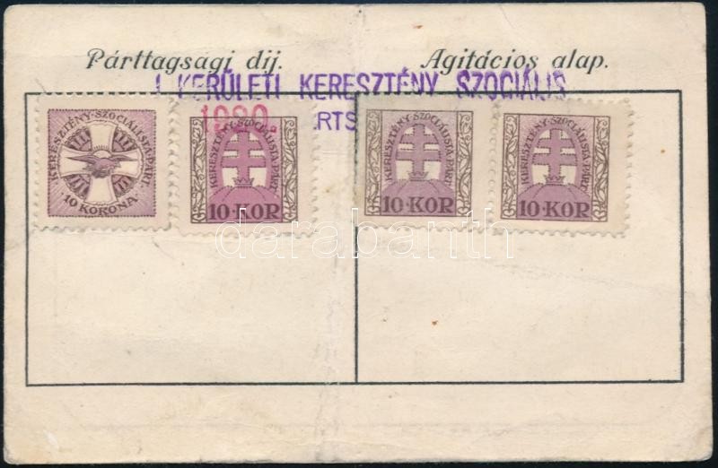 1919 A Keresztényszociális Gazdasági Párt tagsági jegye kitöltve, 4 ta...