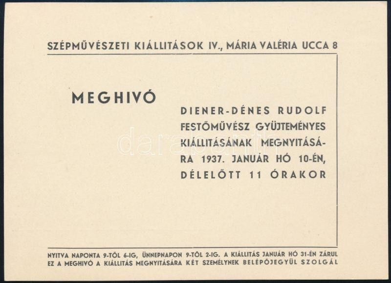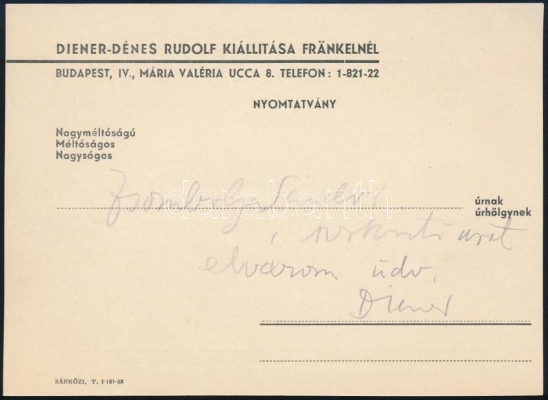 1932 Diener-Dénes Rudolf (1889-1956) festőművész kiállítására szóló meghívó, a művész saját kézzel írt és aláírt meghívó soraival