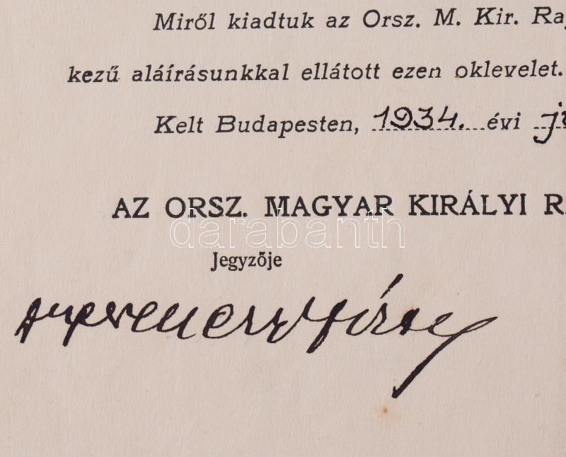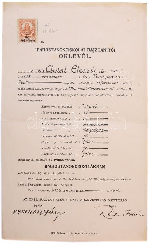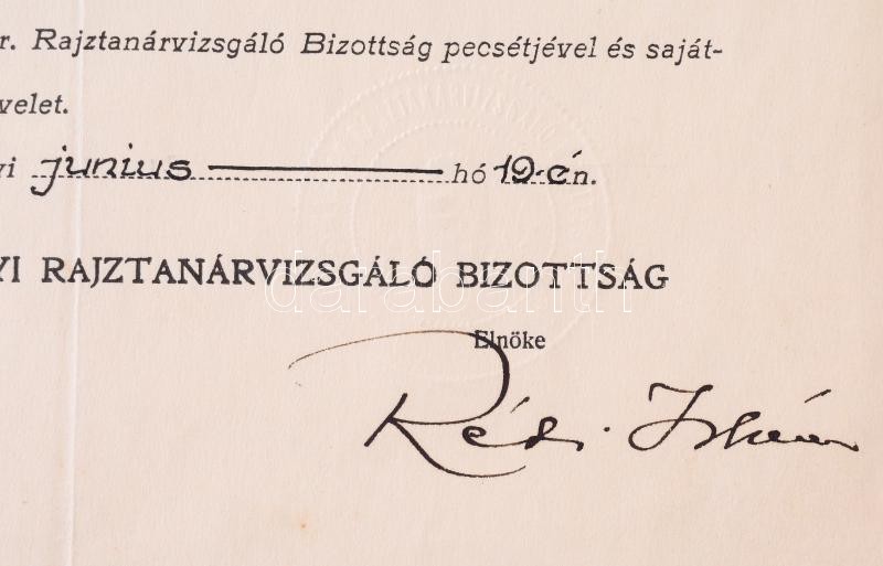 1934 F. Antal Elemér (1896-1995) festőművész iparostanonciskolai rajztanítói oklevele, rajta Rét István (1872-1945) az Országos M. Kir. Képzőművészeti Főiskola rektorának (1932-1935) és Ferenczy Józsefnek a főiskola jegyzőjének aláírásaival. + F. Antal Elemér (1896-1995): Mokuska/Vera, szénrajz, papír, jelzés nélkül, foltos, 31x22,5 cm