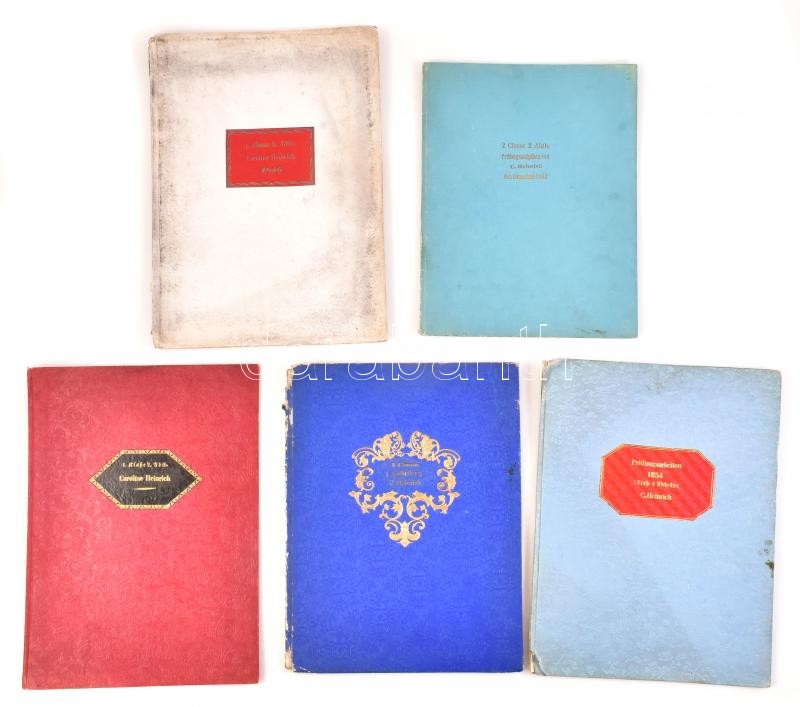 Description: cca 1852-1856 Heinrich Karolina, Heinrich István testvérének magyar, német, angol és francia nyelvű dolgozatai, iskolai munkái, 5 db füzet korabeli díszes vászonkötésben, helyenként kopott borítóval és sérült gerinccel