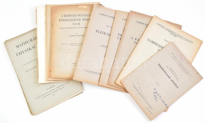 1897-1954 Vegyes matematikával, fizikával kapcsolatos tétel, db. Budó Ágoston-Kovács István: Molekula színképek, Wodetzky József: A három test problémája és a zéta Cancri rendszere, Bardócz Árpád: Azonos energiatartalmú villamos szikra-kisülés sorozatok előállítása, Császár Elemér: A röntgen-sugárzás enerigájának mérése I. és II. köt., Farnóczy Tamás: Fizikai hangtan, Simonyi Károly: Érnélküli kábelek üreg-rezonátorok, Bay Zoltán: A rádióhullámok tovaterjedése, Szigeti György: Lumineszkáló anyagok fizikája, Hoffmann Tibor: Dielektronok elmélete, Mattyasóvszky Kázmér Kászon: A Descartes-féle koordináta-tarnszformáció-csoportok, Mathematikai és Physikai Lapok VI. évf. II. füz., XXV. évf. I. füzet. Papírkötések, változó állapotban, közte egy szakadozott, széteső állapotú is.