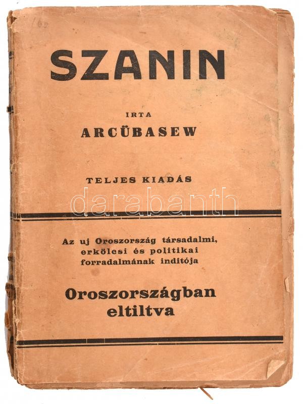 Arcübasew: Szanin. Teljes kiadás. Bp., 1918, Rozsnyai Károly Kiadása. ... https://www.darabanth.com/en/398-Online-auction/398.0/Books/Books-Other-rarities~1500020/Arcubasew-Szanin-Teljes-kiadas-Bp-1918-Rozsnyai-Karoly-Kiadasa-Kiadoi-papirkotes-sza~II2425722