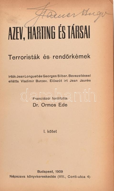 Jean Bonguet és Georges Silber: Terroristák és rendőrkémek, Azer, Harting és társai, I. kötet, Ford.: Dr. Ormos Ede, Bp., 1909, Népszava, Egészvászon-kötés, jó állapotban.