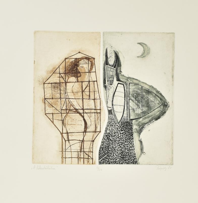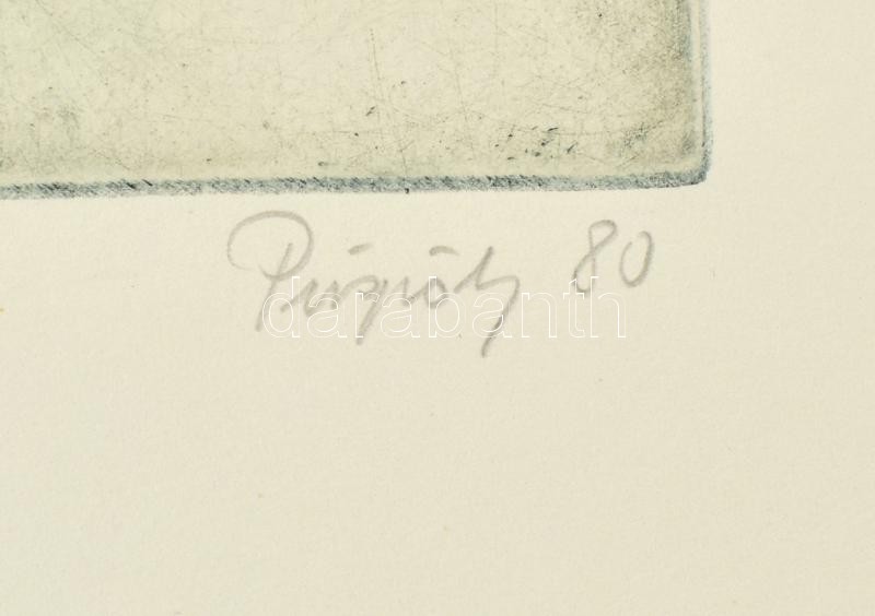 Description: Püspöky István (1950-2018). A Kékszakállúhoz, 1980. Rézkarc, papír. Jelzett. Számozott (13/50). Az 1981-ben, Bartók Béla születésének 100. évfordulójára, a a Képzőművészeti Alap kiadásában megjelent mappából. 26x28,5 cm