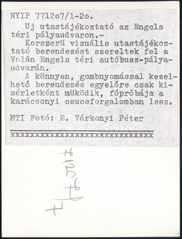 cca 1970 Budapest, új utastájékoztató az Engels téri pályaudvaron, hátoldalon feliratozott MTI sajtófotó, 12×9 cm