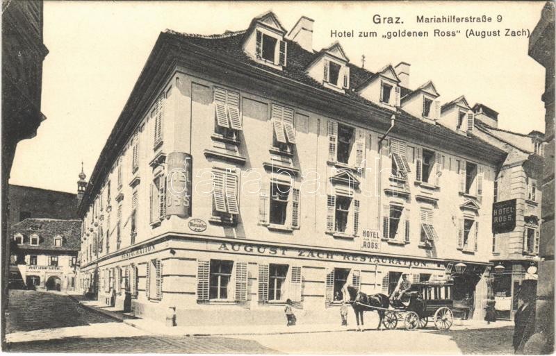 Graz (Steiermark), Hotel zum "goldenen Ross" (August Zach) Mariahilferstraße 9. / hotel, inn, restaurant, horse-drawn carriage (EK)