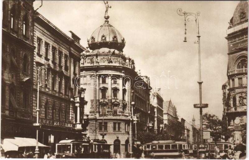 Budapest VIII. Rákóczi út, Blaha Lujza tér, Emke Kávéház, villamosok, takarékpénztár