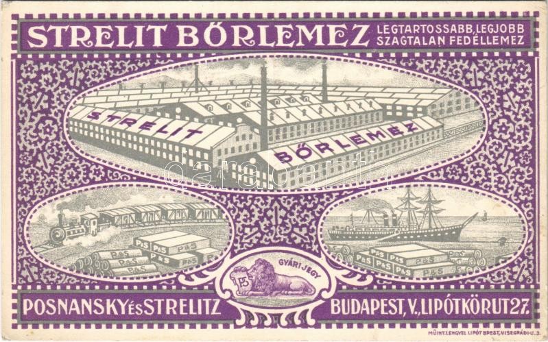 Description: Budapest XIII. Posnansky és Strelitz reklámlapja, Strelit bőrlemez. Lipót körút (Szent István körút) 27. Lengyel Lipót Műintézet. Art Nouveau, litho (EK)