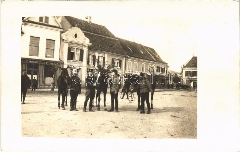 Nagyszeben, Hermannstadt, Sibiu; tér, Frieda Zimmerer üzlete, gyógyszertár, étterem, magyar lovas katonák / square, shops, pharmacy, restaurant, Hungarian cavalrymen. photo