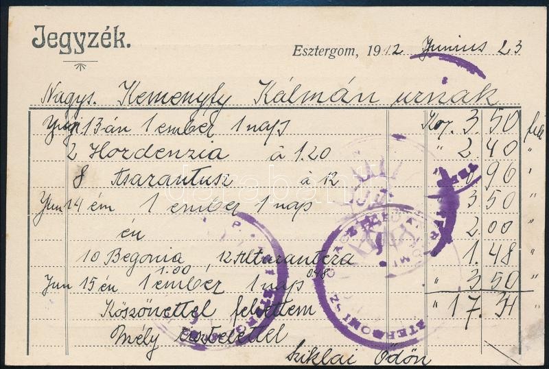 Description: 1912 Sziklai (Spilhacsek) esztergomi kertészeti és virágüzlet szecessziós kartonkártyája, hátoldalon Keménfy Kálmán Dániel plébános és egyházi író részére kiállított és sk. aláírt számlajegyzékkel
