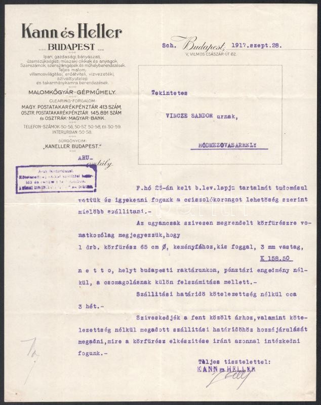 1917 Kann és Heller műszaki gyár gépelt levele, a cég fejléces papíron...
