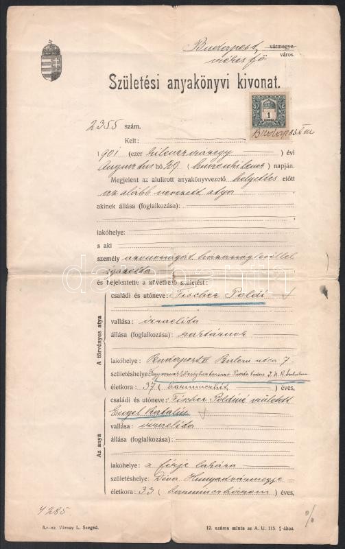 1911 Bp., Születési anyakönyvi kivonat Fischer Poldi izraelita vallású egyén számára, okmánybélyeggel