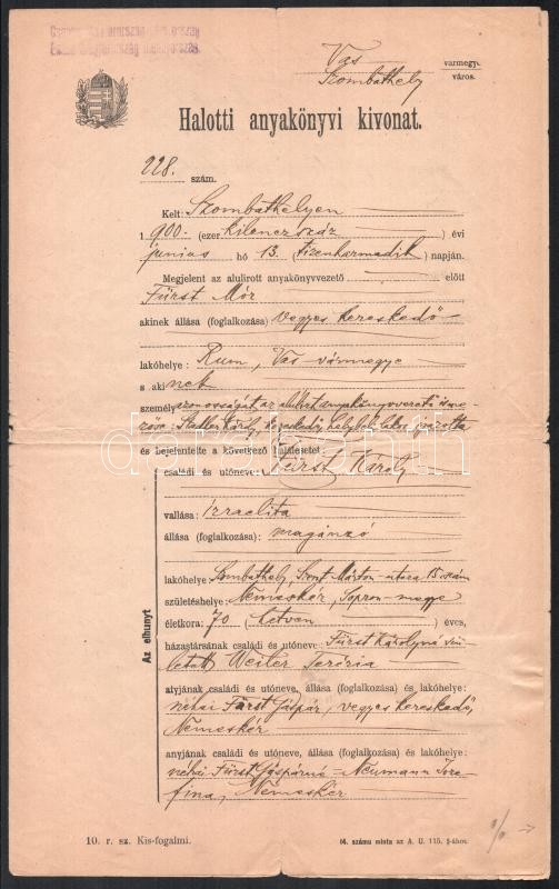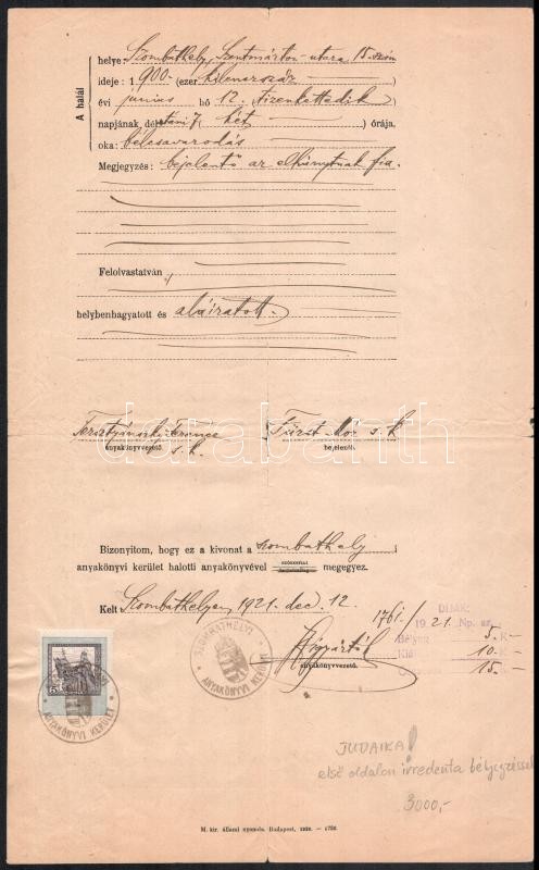 https://www.darabanth.com/en/399-Online-auction/399.0/Art-and-other-collectibles/Judaica~500026/1921-Szombathely-izraelita-vallasu-egyen-halotti-anyakonyvi-kivonata-okmanybelyeggel~II2444165