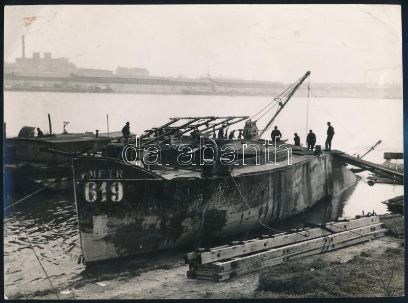 cca 1955 Magyar Folyam- és Tengerhajózási Rt. hajójának bontása, hátoldalon feliratozott fotó, sarkain törésnyomok, 17×23,5 cm