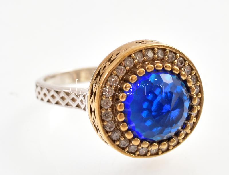 Ezüst(Ag) gyűrű, kék kővel, jelzett, méret: 58, bruttó: 5,77 g