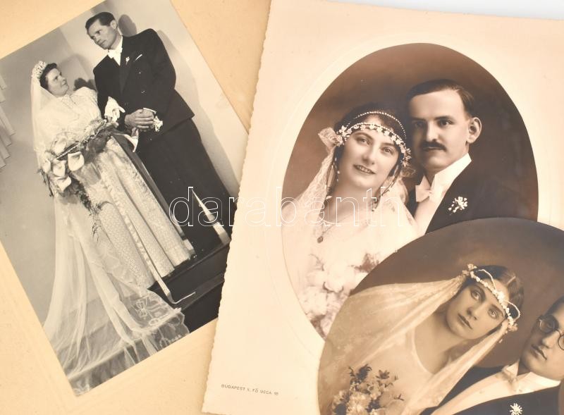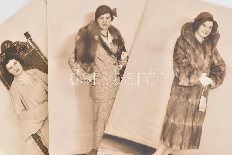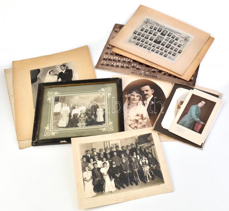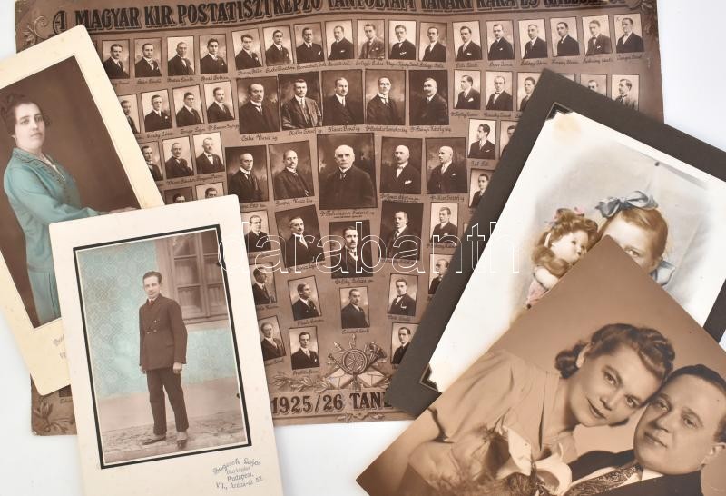 19 darabos régi nagy méretű fotó tétel: Mind jelzett: Bugesch Lajos, színezett, Leitmann Sándor, Blahos, Várkonyi, Magyar Fotó. 3 db tablókép: postatisztképző. pestszenterzsébeti gimnázium, elektrotechnikai iskola, divatfotók, esküvői, családi.