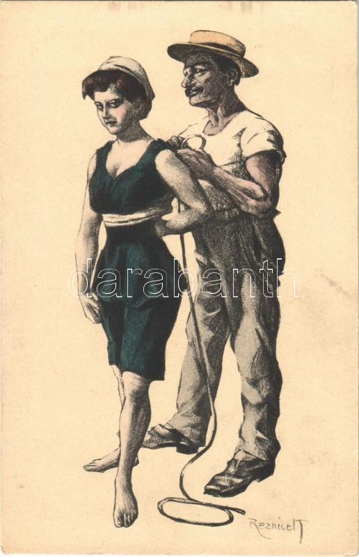 Hölgy korabeli fürdőruhában / Lady in vintage bathing suit. Simlicissimus Karte Serie XI. No. 5. s: Reznicek