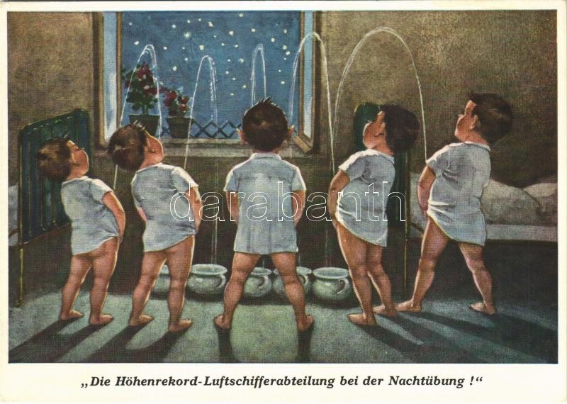 Die Höhenrekord Luftschifferabteilung bei der Nachtübung / Pissing contest, children humor / Pisilőverseny, gyerek humor. 576. Emil Köhn Kunstverlag