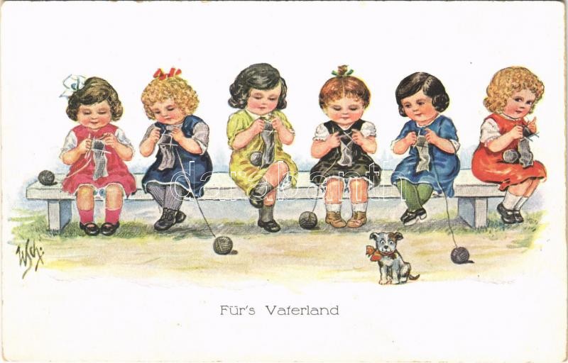 Für's Vaterland / Children art postcard, girls knitting. A.R. & C.i.B....
