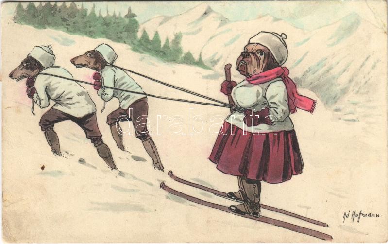 1920 Síelő kutya asszonyság tacskókkal huzatja magát, téli sport, humor / Skiing dog lady drawn by Dachshund dogs, winter sport. A.R. & C.i.B. 314.s: Ad. Hoffmann (r)
