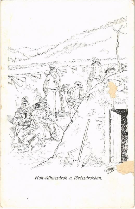 Description: Honvéd huszárok a lövészárokban. Honvédség története 1868-1918 / WWI Austro-Hungarian K.u.K. military art postcard, hussars in the trenches s: Garay (felületi sérülés / surface damage)