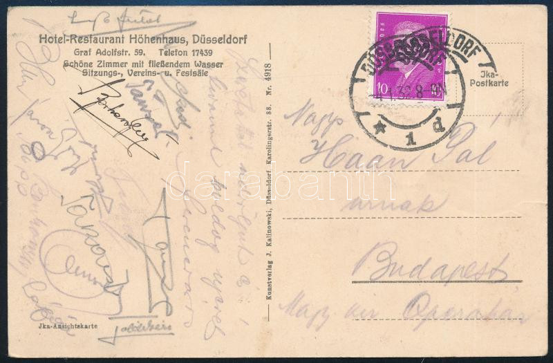 1932. 01.03. A Fradi-Düsseldorf 2:2-es mérkőzés résztvevőinek aláírása képeslapon (Lázár, Papp, Sárosi, Lyka, Szedlacsek, Turay, Amsel, Bukovi, Takács II., Berkessy, Háda, Blum edző)