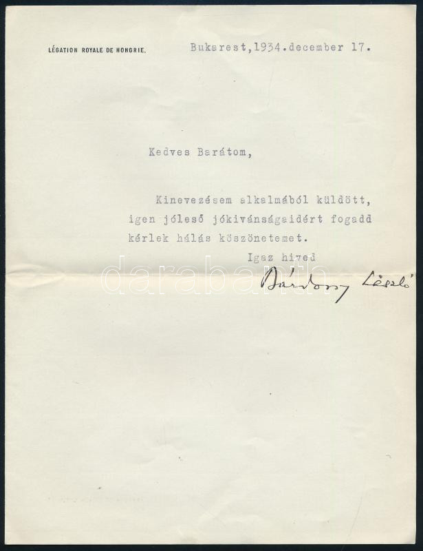 Description: 1934 Bárdossy László (1890-1946) későbbi magyar miniszterelnök aláírása bukaresti nagykövetté való kinevezése alkalmából küldött gratulációt megköszönő levélen