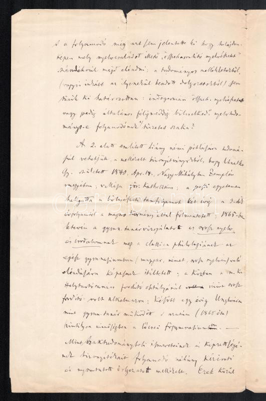 Description: 1874 Budenz József (1836-1892) nyelvtudós autográf írással megírt aktája Ihnátkó György tanár, az összehasonlító nyelvészeti tanszékre való kinevezésnek ügyében. Négy beírt oldal.