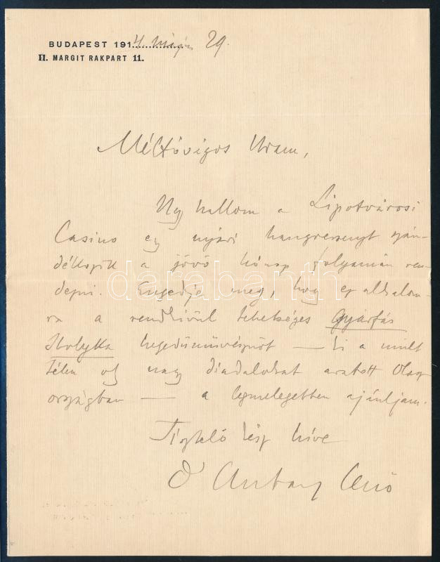 1914 Hubay, Jenő (1858-1937) zeneszerző autográf levele Rust József (1...