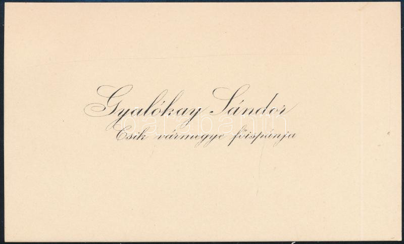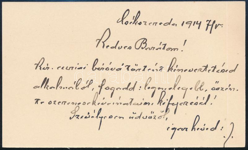 1914 szentgyörgyi Gyalókay Sándor (1863-1943) Csik vármegye főispánjának sajátkezű gratuláló sorai névjegykártyája hátoldalán, Bary József (1858-1915) királyi törvényszéki elnök, a tiszaeszlári vérvádper vizsgálóbírója részére, a kúriai bírói kinevezése kapcsán.