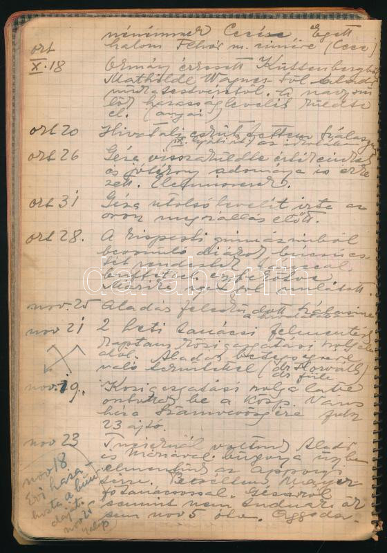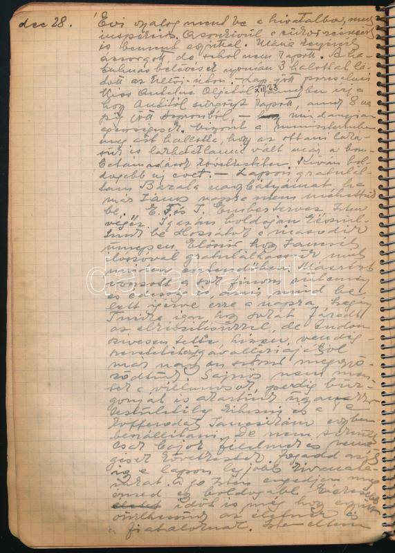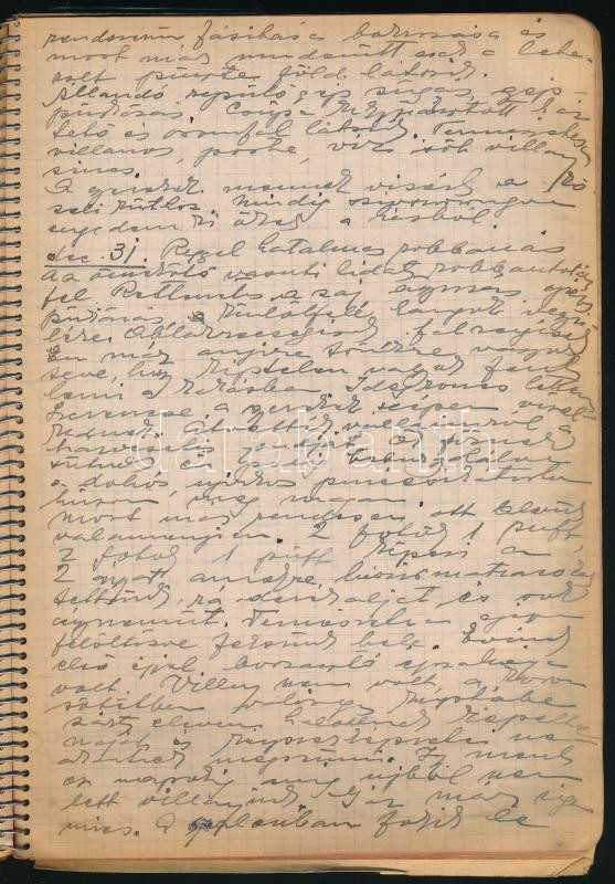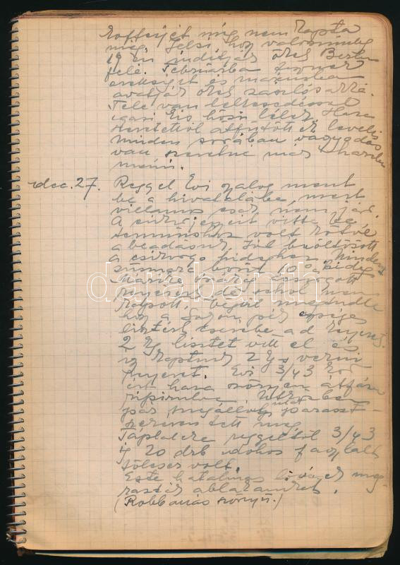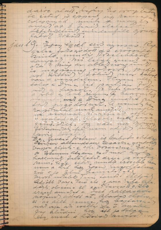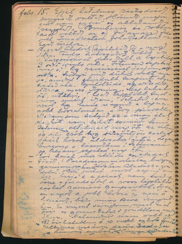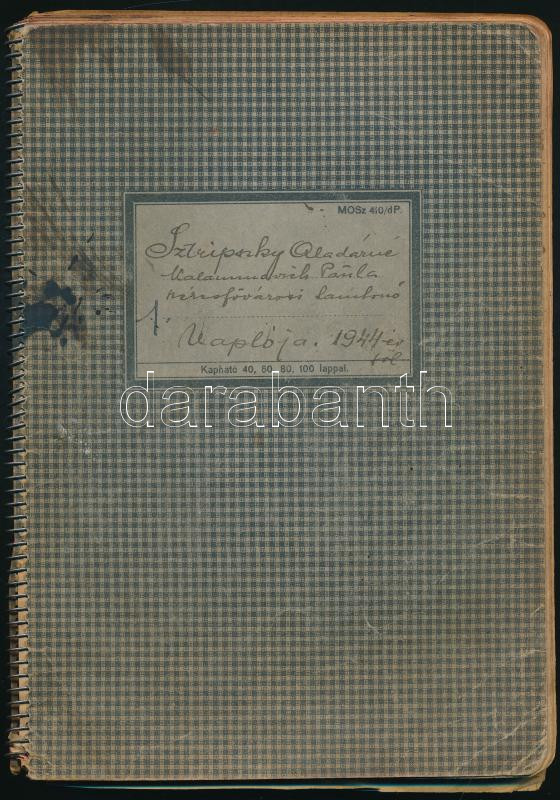 1944-1945 Sztripszky Aladárné Kalamenovich Paula (1898 k.-1977) székesfővárosi tanárnő saját kézzel írt naplója 1944. jan. 1. - 1945. február 18. Benne Budapest ostromára vonatkozó izgalmas részekkel, pl.: Okt. 20., "Hivatali esküt tettem Szálasira az iskolában...", dec. 27. "Reggel Évi gyalog ment be a hivatalba mmert villamos csak nem jár.", dec. 31. "Reggel hatalmas robbanás. Az összekötő vasuti hidak(at) robbantották fel.", jan. 12. "Egyedül aludtam a pincében...", jan. 19. "Egész éjjel erős ágyúzás." Foltos borítójú spirálfüzetben, az elülső borítón szakadással.