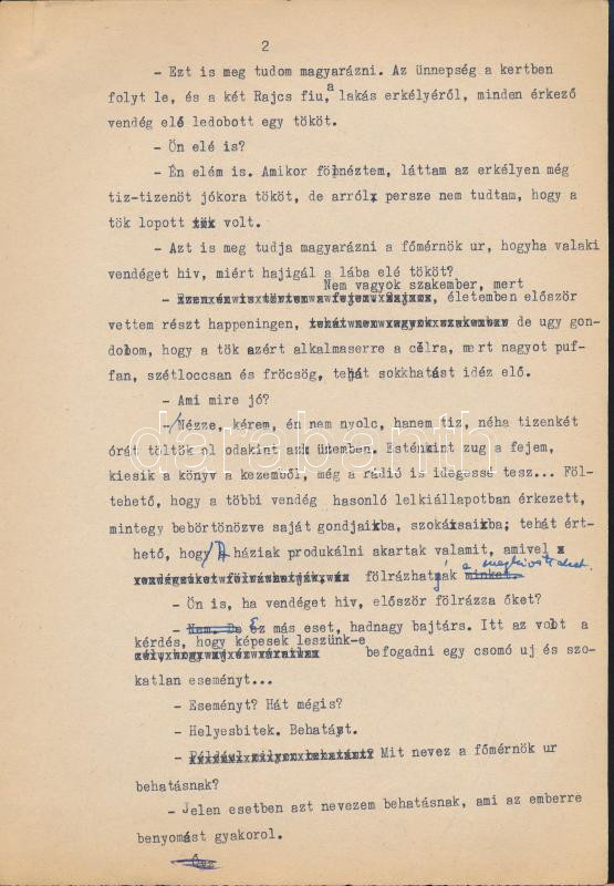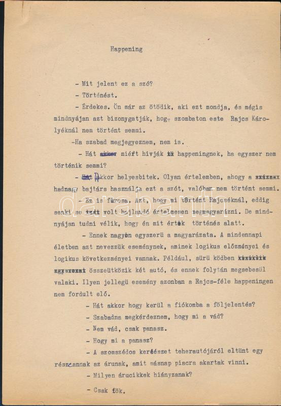 cca 1960 Örkény István (1912-1979) író saját kezű javításaival ellátott Happening c. művének gépelt kézirata 5 lapon.
