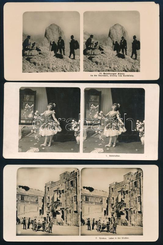 cca 1900 Sztereo fotók kisebb tétele, 3 db vintage fotó ezüst zselatinos fotópapíron (Syrakus, Salzburger Alpen, balerina), 8,9x17,8 cm