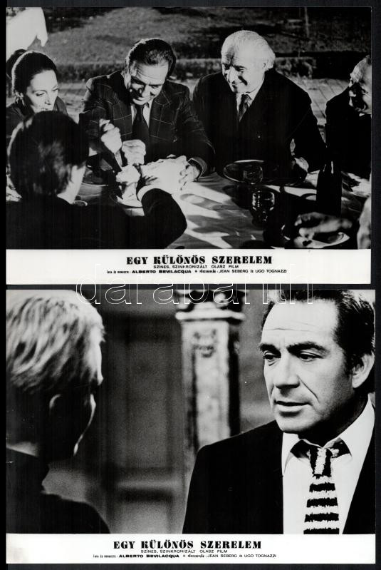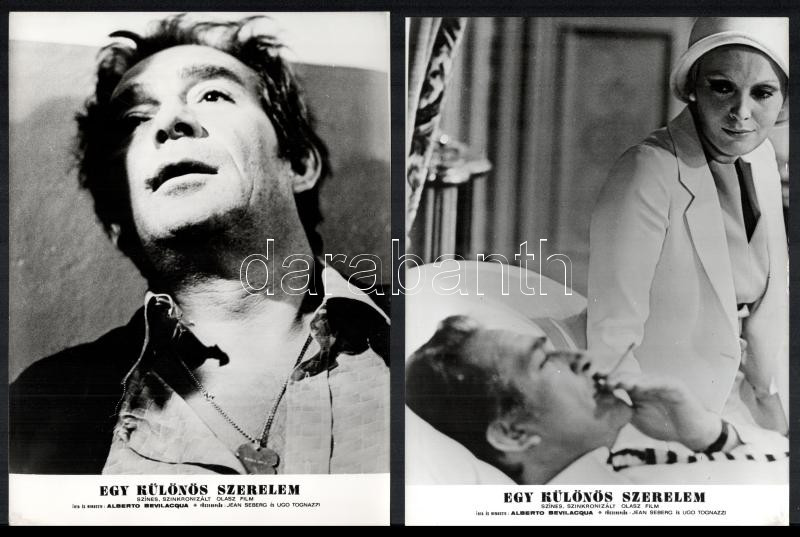 Description: cca 1972 ,,Egy különös szerelem" című olasz film jelenetei és szereplői, (köztük Jean Seberg és Ugo Tognazzi) 10 db vintage produkciós filmfotó ezüst zselatinos fotópapíron, a használatból eredő (esetleges) kisebb hibákkal, 18x24 cm