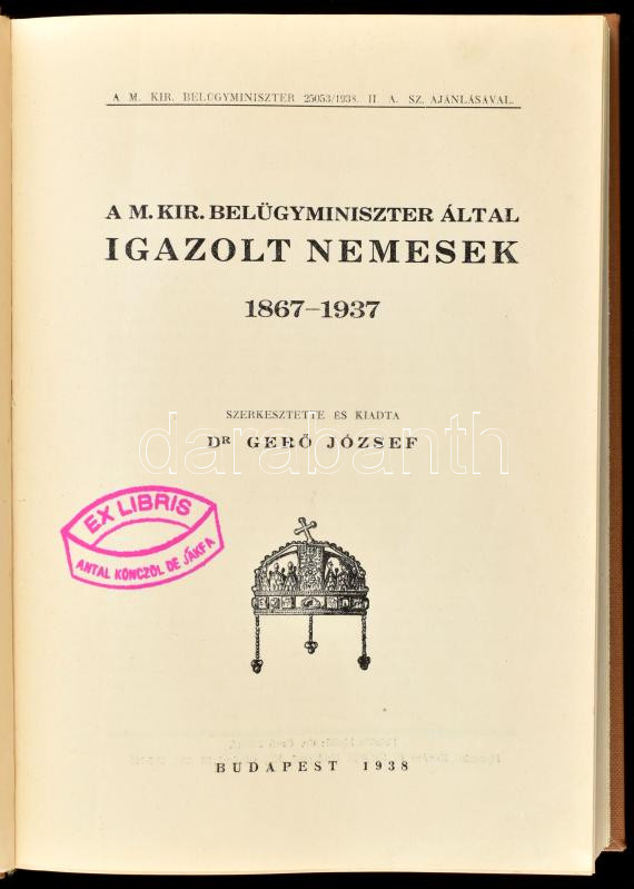 Gerő József: A M. Kir. Belügyminiszter által igazolt nemesek 1867-1937... https://www.darabanth.com/en/40-Major-auction/40.1/Books/Books-History~16424/Gero-Jozsef-A-M-Kir-Belugyminiszter-altal-igazolt-nemesek-1867-1937-Szerk-es-kiadta-Dr-~II2868051