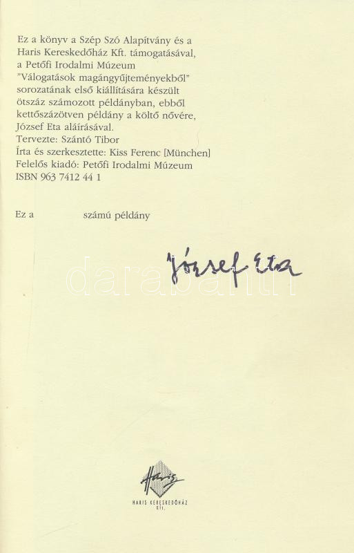 ,,Őriznek engem, óvnak, szeretnek -" József Attila kéziratainak és dedikált könyveinek kiállítása a Petőfi Irodalmi Múzeumban. Írta és szerk.: Kiss Ferenc. Bp., 1993, Petőfi Irodalmi Múzeum, (64) p. Kiadói papírkötés, kiadói papír védőborítóban, jó állapotban. "(..) készült ötszáz számozott példányban, ebből kettőszázötven példány a költő nővére, József Eta aláírásával." József Etelka (Eta) (1903-2004), József Attila nővére által aláírt, számozatlan példány!