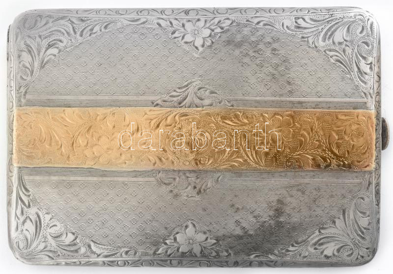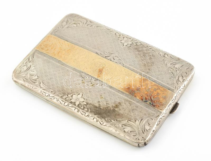 Ezüst (Ag) díszes cigaretta tárca, aranyozott középső résszel, sérült,...