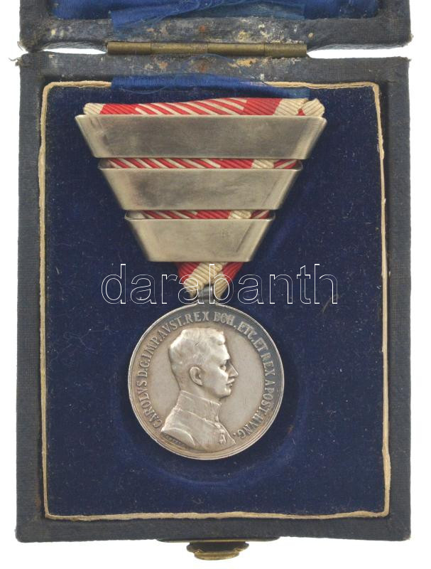 1917. "Károly Ezüst Vitézségi Érem II. osztálya, negyedszeri adományozás" peremen jelzett Ag kitüntetés mellszalagon, eredeti, viseltes dísztokjában. Szign.: Kautsch T:AU,XF / Hungary 1917. "Silver Gallantry Medal, 2nd Class, awarded for the fourth time" Ag decoration with hallmark on the edge, on ribbon, in its original, worn decorative case. Sign.: Kautsch C:AU,XF NMK 309.