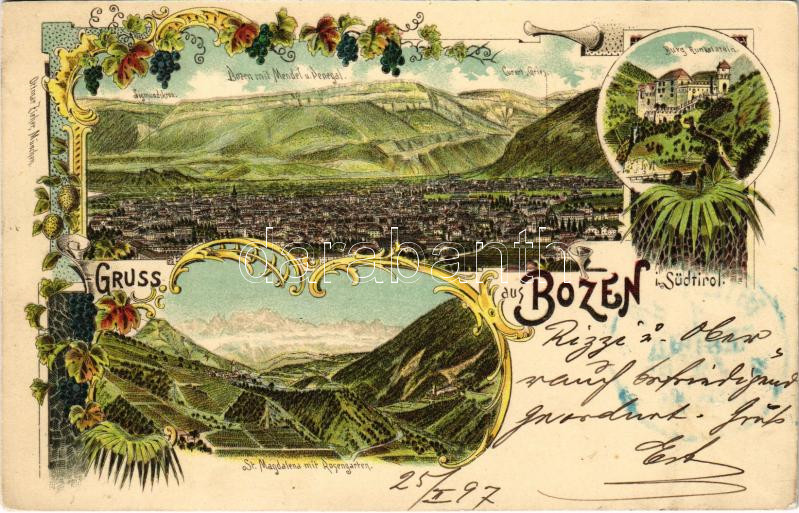 Description: 1897 (Vorläufer) Bolzano, Bozen (Südtirol); Burg Runkelstein, Mendel und Penegal, St. Magdalena mit Rosengarten. Ottmar Zieher / castle. Art Nouveau, floral, litho + "BOZEN BAHNHOF"