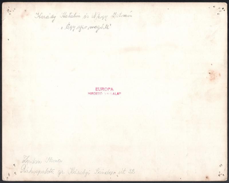 Description: Karády Katalin (1910-1990) színésznő dedikált fotója Nagy István a Egy szív megáll c. filmből. Nagy méretű pecséttel jelzett fotó a sarkán rajzszög nyomokkal 30x24 cm